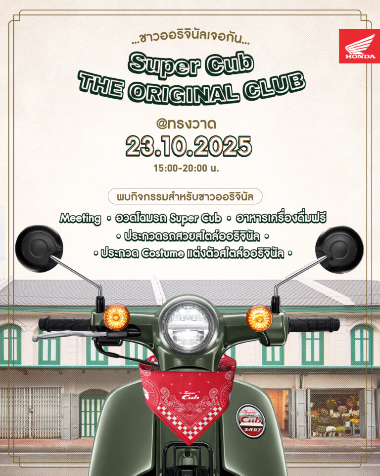 รถจักรยานยนต์ฮอนด้าเชิญชวนเหล่าสาวกผู้หลงใหลในเสน่ห์ความคลาสสิกของ Super Cub มารวมพลเฉลิมฉลองความออริจินัลในงาน “Super Cub THE ORIGINAL CLUB MEETING” การพบปะสุดพิเศษของคนรัก Super Cub ที่จะได้มาร่วมสร้างประสบการณ์เหนือระดับไปด้วยกัน ในวันพฤหัสบดีที่ 23 ตุลาคม 2568 เวลา 15.00 – 20.00 น. ณ Mahapho Riverview