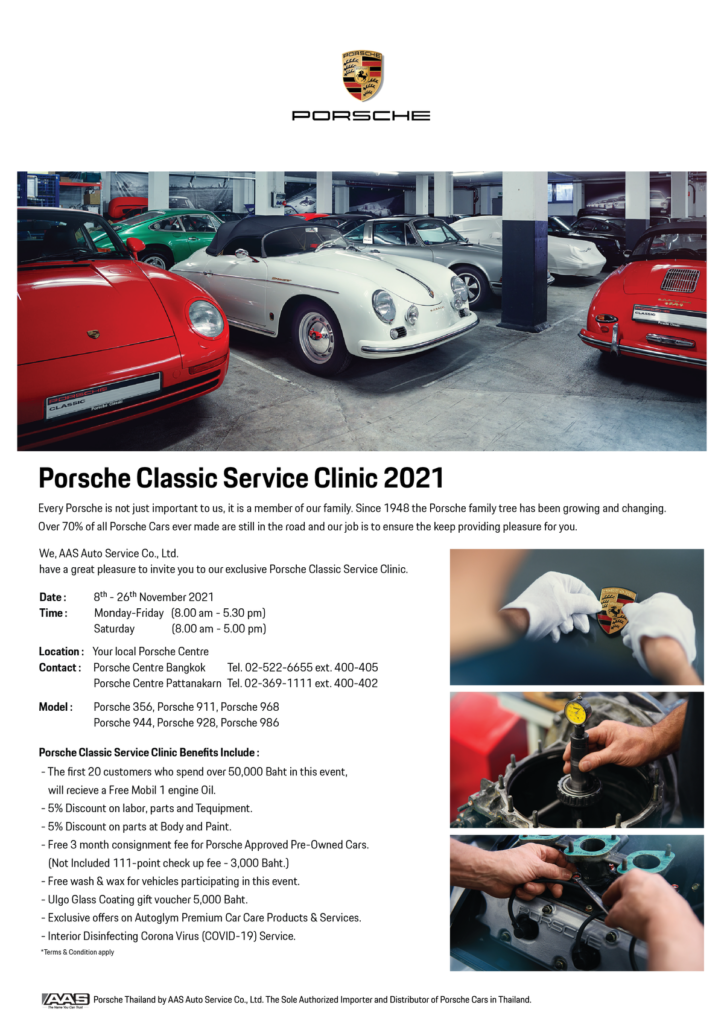 แคมเปญ Porsche Classic Service Clinic 2021 พร้อมบริการให้แก่ผู้ขับขี่รถยนต์ปอร์เช่ จาก บริษัท เอเอเอส ออโต้ เซอร์วิส จำกัด โดยสามารถนัดหมายเพื่อเข้ารับบริการได้ที่