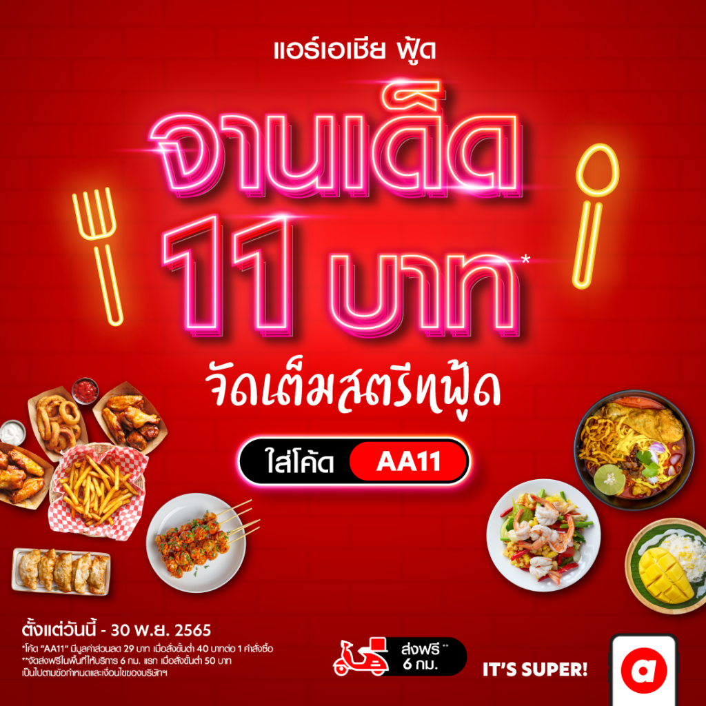 - airasia Super App ยังต่อยอดการสนับสนุนผู้ประกอบการร้านอาหารสตรีทฟู้ดให้ขายดีขึ้น พร้อมช่วยแบ่งเบาค่าครองชีพคนไทย airasia food มอบส่วนลดพิเศษด้วยโปรฯ “อิ่มอร่อย 11 บาท“ เมื่อสั่งอาหารจากร้านสตรีทฟู้ดที่เข้าร่วมรายการ เพียงมียอดสั่งขั้นต่ำ 40 บาท มื้อนั้นจ่ายค่าอาหารเพียงแค่ 11 บาทเท่านั้น อย่าช้า! เพียงใส่โค้ด “AA11” พร้อมส่งฟรีถึงบ้านทันที! 6 กม.แรก อย่ารอช้า เริ่มวันนี้ถึง 30 พฤศจิกายนนี้เท่านั้น