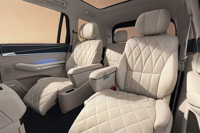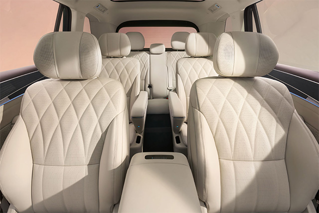 ห้องโดยสารของรถซึ่งมีรูปแบบเบาะ 3 แถว 7 ที่นั่ง เต็มไปด้วยหน้าจอทั้งจอลอยตัวตรงกลาง จอด้านหน้าผู้โดยสารที่เบาะหน้า และจอขนาด 17.3 นิ้วที่เพดานสำหรับเบาะหลัง นอกจากนี้ยังให้ความสบายในการเดินทางด้วยเบาะหน้า Zero Gravity