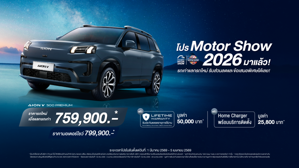 GAC AION Thailand ประกาศความยิ่งใหญ่ในงาน Bangkok International Motor Show 2026 ขนทัพยนตรกรรมพลังงานทางเลือกใหม่จัดแสดงแบบเต็มพิกัด พร้อมไฮไลต์สำคัญถึง 3 ประการ ได้แก่ การเผยโฉมรถยนต์รุ่นใหม่ล่าสุด GAC AION V 500, การประกาศนโยบาย GAC CARE เพื่อยกระดับมาตรฐานการบริการหลังการขายแบบครบวงจร,และเปิดตัวโครงการ GAC Easy Trade-in, สะท้อนความมุ่งมั่นในการสร้างระบบนิเวศยานยนต์ไฟฟ้าที่สมบูรณ์แบบและยั่งยืนในประเทศไทย