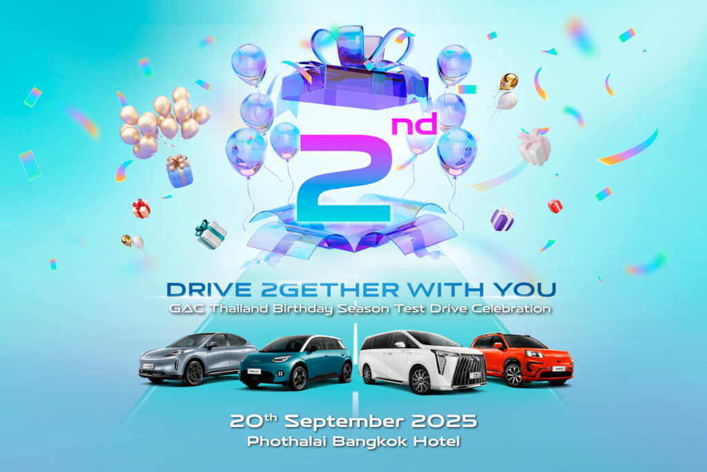 เพื่อเป็นการเฉลิมฉลองความสำเร็จตลอด 2 ปี GAC ประเทศไทย จึงได้จัดกิจกรรม “DRIVE 2GETHER WITH YOU” ในวันเสาร์ที่ 20 กันยายน 2568 ณ โรงแรมโพธาลัย กรุงเทพ (Phothalai Bangkok Hotel) ภายในงาน ท่านจะได้สัมผัสประสบการณ์การทดลองขับรถยนต์พลังงานใหม่จาก GAC อย่างใกล้ชิด พร้อมร่วมกิจกรรมสนุกๆ และลุ้นรับของรางวัลมากมายตลอดวัน พิเศษสุดสำหรับลูกค้าที่จองรถยนต์ GAC ภายในงาน จะได้รับของขวัญสุดเอ็กซ์คลูซีฟทันที พร้อมรับสิทธิ์ลุ้นเป็นผู้โชคดีคว้ารางวัลใหญ่ภายในงานอีกด้วย