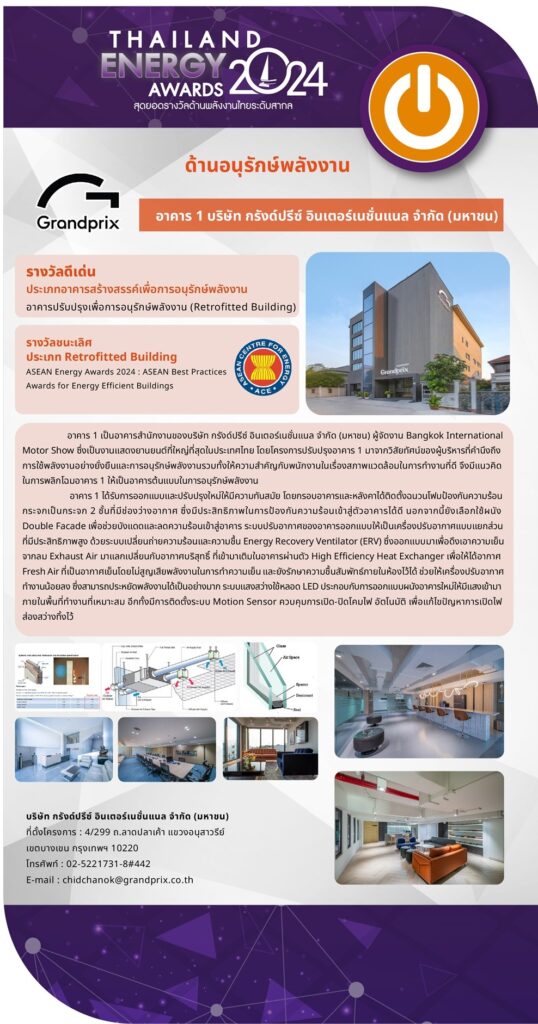 บริษัท กรังด์ปรีซ์ อินเตอร์เนชั่นแนล จำกัด (มหาชน) โดย นายพีระพงศ์ เอี่ยมลำเนา ประธานเจ้าหน้าที่บริหาร เข้ารับรางวัลดีเด่น ประเภทอาคารสร้างสรรค์เพื่อการอนุรักษ์พลังงาน สาขา อาคารปรับปรุงเพื่อการอนุรักษ์พลังงาน (Retrofitted Building) ซึ่งถือเป็นอีกหนึ่งรางวัลอันทรงเกียรติ ในงาน “Thailand Energy Awards 2024” จัดโดยกรมพัฒนาพลังงานทดแทนและอนุรักษ์พลังงาน (พพ.) กระทรวงพลังงาน โดยได้รับเกียรติจาก นายอรรถพล ฤกษ์พิบูลย์ รัฐมนตรีว่าการกระทรวงพลังงาน เป็นประธานในพิธีมอบรางวัล ณ ห้องแซฟไฟร์ 202 อาคารอิมแพ็ค ฟอรั่ม ชั้น 2 อิมแพ็ค เมืองทองธานี เมื่อวันอังคารที่ 23 ธันวาคม 2568 ที่ผ่านมา