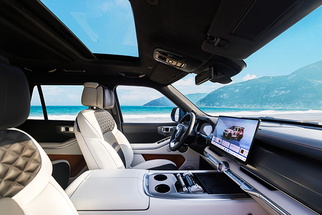 ส่วนห้องโดยสารของรถมีจอแสดงข้อมูลการขับขนาด 12.3 นิ้ว จอตรงกลางขนาด 15.6 นิ้ว รวมทั้งมีจอขนาด 17.3 นิ้วเพื่อความบันเทิงสำหรับเบาะหลังในเกรดสูง และแม้จะเป็นรถออฟโรดสไตล์แกร่ง แต่ก็มาพร้อมกับความสบายในการเดินทางด้วยเบาะหุ้มหนังปรับไฟฟ้า 20 ทิศทาง พร้อมระบบปรับความอุ่นและระบายอากาศ รวมทั้งมีระบบเสียงลำโพง 21 ตำแหน่ง