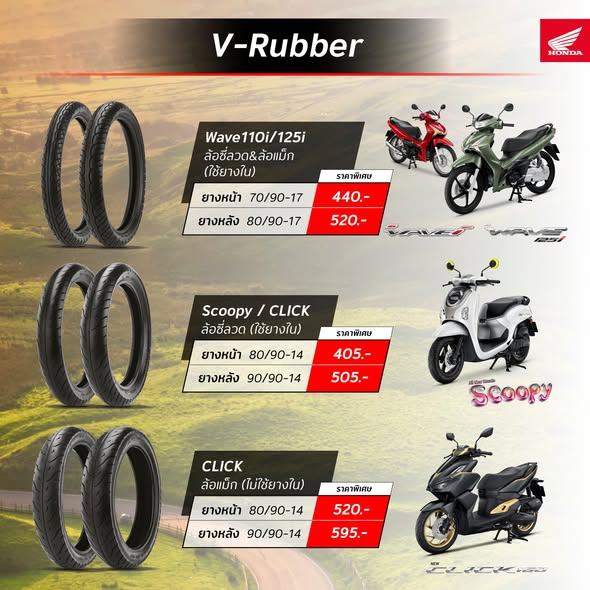 โปรโมชัน “ยางไงก็คุ้ม” คัดสรรยางที่เหมาะสมกับรถจักรยานยนต์ฮอนด้าหลากหลายรุ่น ครอบคลุมทั้งรถครอบครัวและรถออโตเมติก ตอบโจทย์การใช้งานจริงทั้งด้านคุณภาพ ความทนทาน และความคุ้มค่า โดยมีรายละเอียดดังนี้