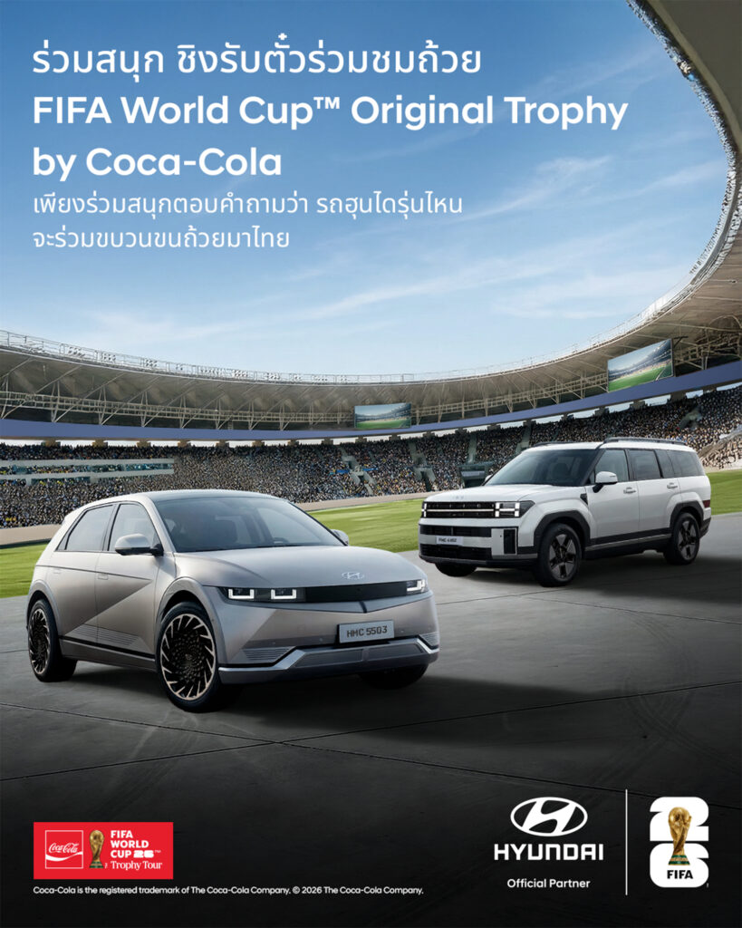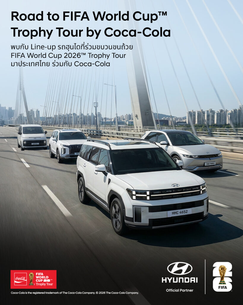 กระแสฟุตบอลโลกเริ่มอุ่นเครื่องก่อนศึกใหญ่จะเปิดฉากอย่างเป็นทางการ เมื่อ ฮุนได จับมือกับ “โคคา–โคล่า” จุดประกายความคลั่งไคล้ลูกหนังในประเทศไทย ผ่านกิจกรรมระดับโลก FIFA World Cup 2026™ Trophy Tour by Coca-Cola นำถ้วยแห่งประวัติศาสตร์อันทรงคุณค่าและยิ่งใหญ่ที่สุดในวงการฟุตบอลอย่าง FIFA World Cup™ Trophy เดินทางมาให้แฟนบอลชาวไทยได้สัมผัสของจริงแบบใกล้ชิด ก่อนศึก FIFA World Cup 2026™ จะระเบิดความมันทั่วโลก โดยฮุนไดในฐานะ Mobility Partner จัดขบวนรถยนต์พิเศษทำหน้าที่ขนส่งถ้วยแชมป์สัญลักษณ์แห่งความฝัน ความสำเร็จ และเกียรติยศสูงสุดของนักฟุตบอลอาชีพ สร้างโมเมนต์ประวัติศาสตร์ให้คอบอลไทยได้ร่วมเป็นส่วนหนึ่ง ท่ามกลางบรรยากาศการนับถอยหลังสู่มหกรรมลูกหนังที่แฟนกีฬาทั่วโลกเฝ้ารอ