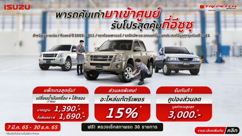โปรโมชันพิเศษทั้ง 3 คุ้มนี้สามารถใช้ร่วมกันได้ โดยสามารถเข้ารับบริการได้ตั้งแต่วันที่ 7 มีนาคม 2565 – 30 ธันวาคม 2565 สอบถามเพิ่มเติมที่ศูนย์บริการมาตรฐานอีซูซุทั่วประเทศ หรือสายด่วนลูกค้าสัมพันธ์ โทร. 0-2118-0777 หรือที่ https://www.isuzu-tis.com/service/news-promotions/old-car-campaign/