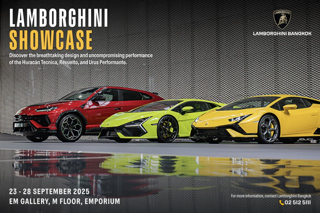 บริษัท เรนาสโซ มอเตอร์ จำกัด ตัวแทนจำหน่ายรถยนต์ลัมโบร์กินีอย่างเป็นทางการรายเดียวในประเทศไทย นำโดย อภิชาติ ลีนุตพงษ์ ประธานกรรมการ, ศักดิ์ นานา และ ม.ล.พลอยนภัส ลีนุตพงษ์ กรรมการ ยกทัพจัดแสดงที่สุดแห่งขุมพลังไฮบริด Lamborghini Revuelto และ The Last NA รุ่นไอคอนิกระดับตำนานอย่าง Huracan Tecnica และ Urus Performante ในงาน LAMBORGHINI SHOWCASE 2025 ภายในงานเหล่าสาวกกระทิงดุเตรียมสัมผัสตัวจริงกันอย่างใกล้ชิด นอกจากนี้ยังมีสินค้าคอลเลกชันลัมโบร์กินีให้เหล่าแฟนพันธุ์แท้ได้เลือกช้อปกัน ระหว่างวันที่ 23-28 กันยายน 2568 ณ ดิเอ็มโพเรียม, EM Gallery ชั้น M
