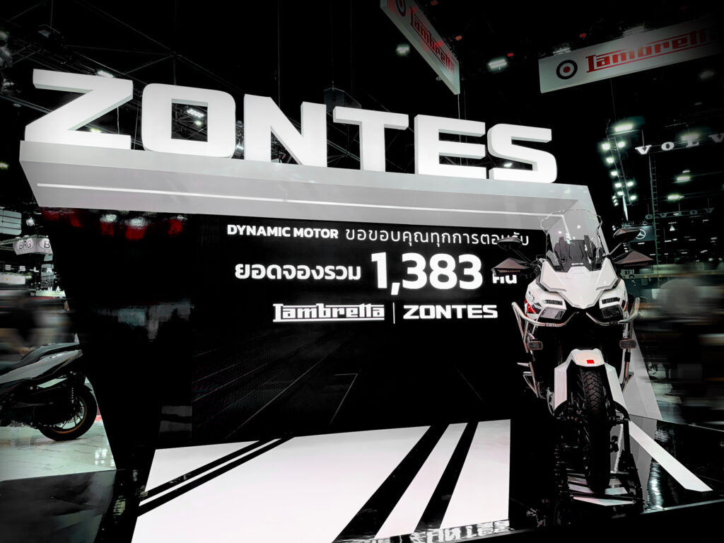ในภาพรวมของการเข้าร่วมงาน Motor Expo 2025 ปีนี้ของ บริษัท ไดนามิค มอเตอร์ (ประเทศไทย) จำกัด ผู้นำเข้าและจัดจำหน่ายอย่างเป็นทางการของ LAMBRETTA (แลมเบรตต้า) และ ZONTES (ซอนเทส) ในประเทศไทย ทั้งสองแบรนด์สามารถทำยอดจองรวมไปได้ถึง 1,383 คัน โดยแบ่งเป็น LAMBRETTA 785 คัน และ ZONTES 615 คัน ซึ่งสะท้อนการตอบรับที่แข็งแกร่ง แม้จะอยู่ในสภาวะตลาดที่มีการแข่งขันสูงและเศรษฐกิจโดยรวมยังไม่ฟื้นตัวเต็มที่