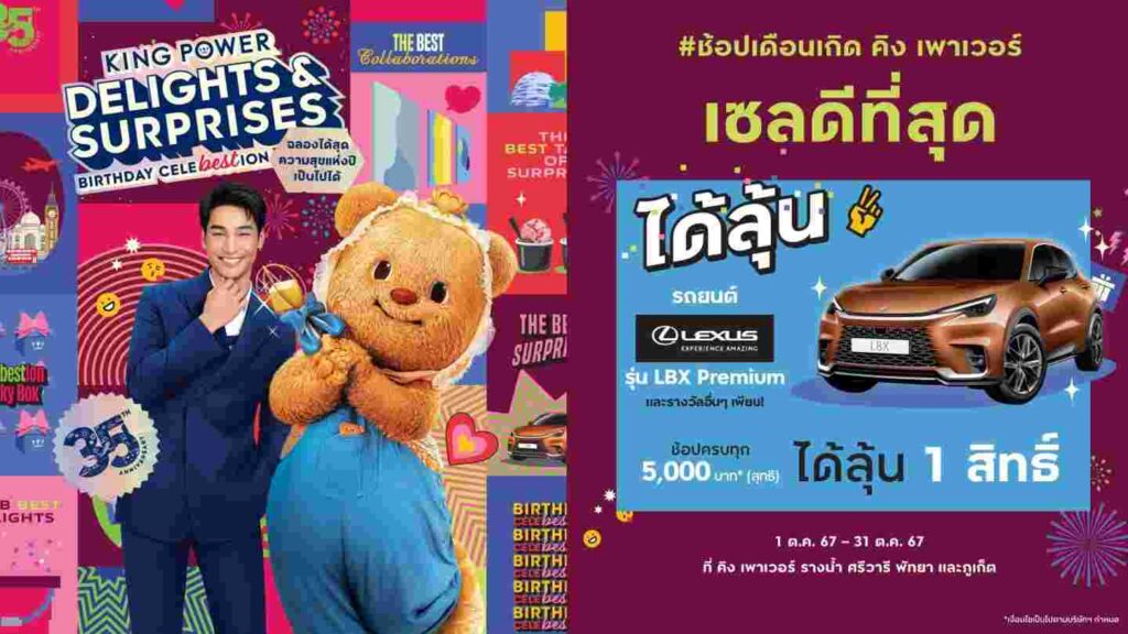 เลกซัส ประเทศไทย ร่วมเฉลิมฉลองครบรอบ 35 ปี คิง เพาเวอร์ มอบรถยนต์เลกซัส รุ่น LBX Premium มูลค่า 2.39 ล้านบาท สำหรับผู้โชคดี ในแคมเปญ “King Power 35th Anniversary Delights & Surprises” “Birthday Celebestion ฉลองได้สุด ความสุขแห่งปี เป็นไปได้” ต่อเนื่องเป็นปีที่ 2 เมื่อช้อปครบ 5,000 บาท พร้อมสิทธิพิเศษ และโปรโมชั่นสุดคุ้มแห่งปี ตลอดเดือนตุลาคม 2567