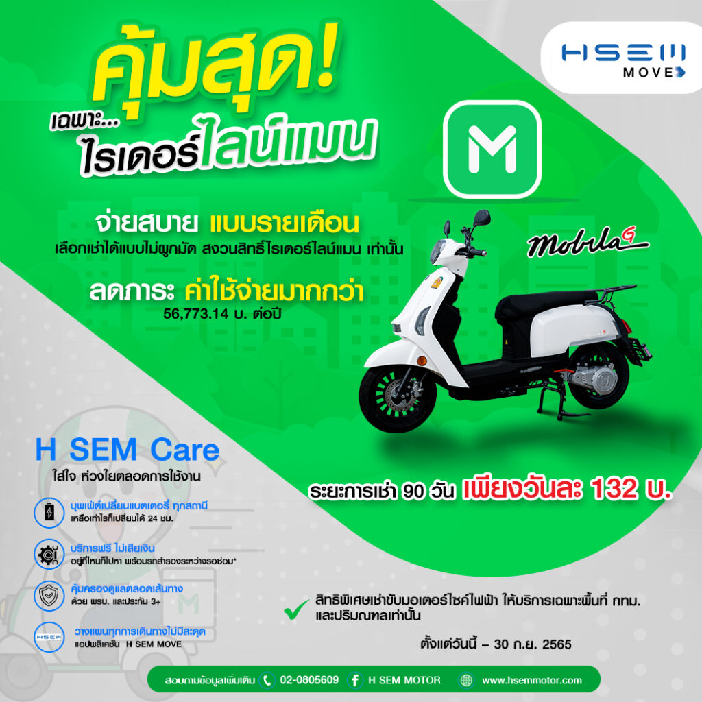 เช่ารถมอเตอร์ไซค์ไฟฟ้า H SEM Mobila G เพียงวันละ 132 บาท ระยะเช่า 90 วัน หรือวันละ 135 บาทกับการเช่า 30 วัน สามารถเปลี่ยนแบตเตอรี่ได้ฟรีตลอด 24 ชม. พร้อมทีมช่วยเหลือที่จะไปหาคุณถึงที่เมื่อประสบปัญหา และแน่นอนมีรถสำรองให้ใช้ระหว่างรอซ่อม ฟรี แถมมี พรบ. และประกันแบบ 3+ ให้อีกด้วย สิทธิพิเศษๆ แบบนี้ รีบจองสิทธิ์ด่วนๆ ผ่านเว็บไซต์ www.linemanrider.com/news/lm-benefits-evmotorbike ตั้งแต่วันนี้ถึง 30 กันยายน 2565 นี้ เท่านั้น