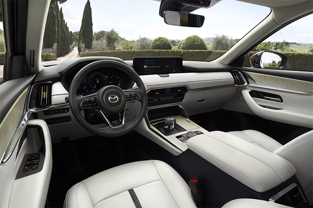 ห้องโดยสารของรถมาพร้อมกับแผงแดชบอร์ดในแบบเดียวกับ CX-60 พร้อมกับใช้วัสดุพรีเมียม มีการแสดงหน้าจอ Infotainment ล่าสุด รวมทั้งระบบสั่งงานด้วยเสียง Alexa ระบบนำทางไฮบริดที่รวมทั้งการใช้งานแบบออฟไลน์และออนไลน์ รวมไปถึงมีระบบ Trailer Hitch View เพื่อดูสิ่งที่ลากจูง และชุดระบบความปลอดภัย i-Activsense เต็มระบบ