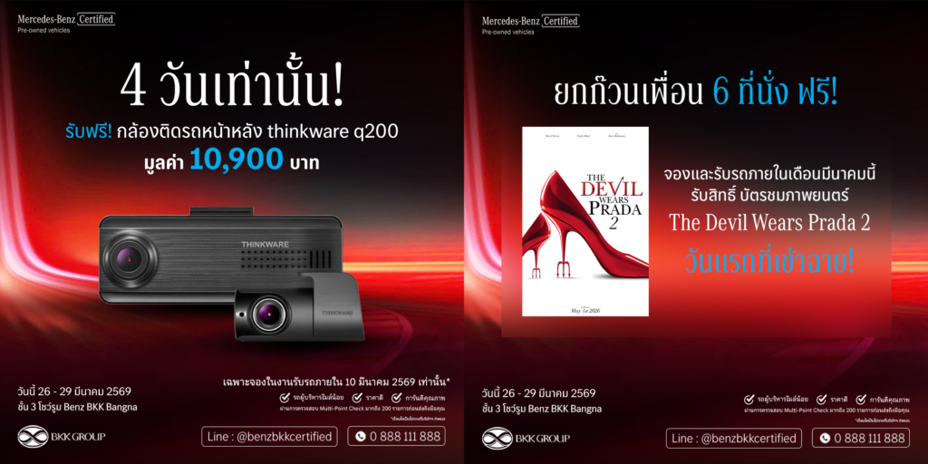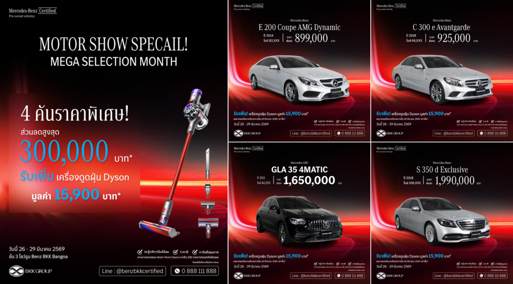 “Mercedes-Benz Certified by Benz BKK Bangna ไม่ได้เป็นเพียงสถานที่จำหน่ายรถยนต์ แต่คือ One-Stop Automotive Solution ที่ลูกค้าสามารถเข้าถึงบริการได้ครบทุกขั้นตอนในช่วง Motor Show ซึ่งเป็นช่วงเวลาที่ผู้บริโภคมีตัวเลือกจำนวนมาก เรามองว่าการตัดสินใจซื้อรถยนต์ในวันนี้ ไม่ได้ขึ้นอยู่กับราคาเพียงอย่างเดียว แต่คือ ‘ความมั่นใจในระยะยาว’ แคมเปญ ‘MOTOR SHOW SPECIAL!’ จึงถูกออกแบบมาเพื่อให้ลูกค้าสามารถตัดสินใจได้ง่ายและมั่นใจมากยิ่งขึ้น ภายในที่เดียว ทั้งการเปรียบเทียบรถใหม่และ Mercedes-Benz Certified พร้อมบริการ Trade-in และโซลูชันทางการเงินที่ตอบโจทย์ความต้องการของลูกค้าแต่ละรายอย่างแท้จริง”