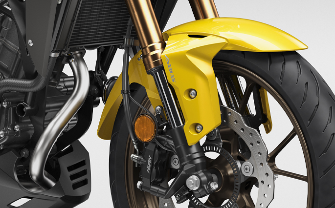 และ UPSIDE-DOWN FRONT SUSPENSION AND HUBLESS FLOATING DISC โช้กหน้าหัวกลับสีทองเข้มขนาดใหญ่ 41 มม. ขนาดเดียวกับรถระดับบิ๊กไบค์ของฮอนด้า ที่ช่วยเรื่องการทรงตัวได้อย่างดีเยี่ยมทุกสภาพถนน มั่นใจในทุกการเบรกด้วยดิสก์เบรกหน้าขนาด 296 มม. แบบจานแยกชิ้น เรเดียลเมาท์ 4 พอต คาลิปเปอร์ พร้อม ABS G-Sensor ระดับเดียวกันกับรถในสนามแข่ง