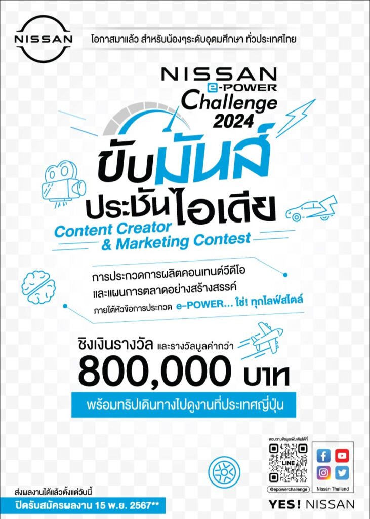 นิสสันชวนนักศึกษาทั่วประเทศโชว์พลังไอเดียสร้างสรรค์ ส่งเสริมความสามารถด้านการผลิตคอนเทนต์ในรูปแบบวิดีโอ และแผนการตลาด ในโครงการ Nissan e-POWER Challenge 2024 ที่จัดขึ้นในธีม “ขับมันส์ ประชันไอเดีย” พร้อมโอกาสร่วมเวิร์กช็อปกับสื่อ และนักผลิตคอนเทนต์ตัวจริงเสียงจริง ก่อนลงมือสร้างสรรค์ผลงานจริง ลุ้นชิงทุนการศึกษา พร้อมทริปไปญี่ปุ่นเพื่อสัมผัสกับนวัตกรรมเทคโนโลยียานยนต์แห่งอนาคตจากนิสสัน