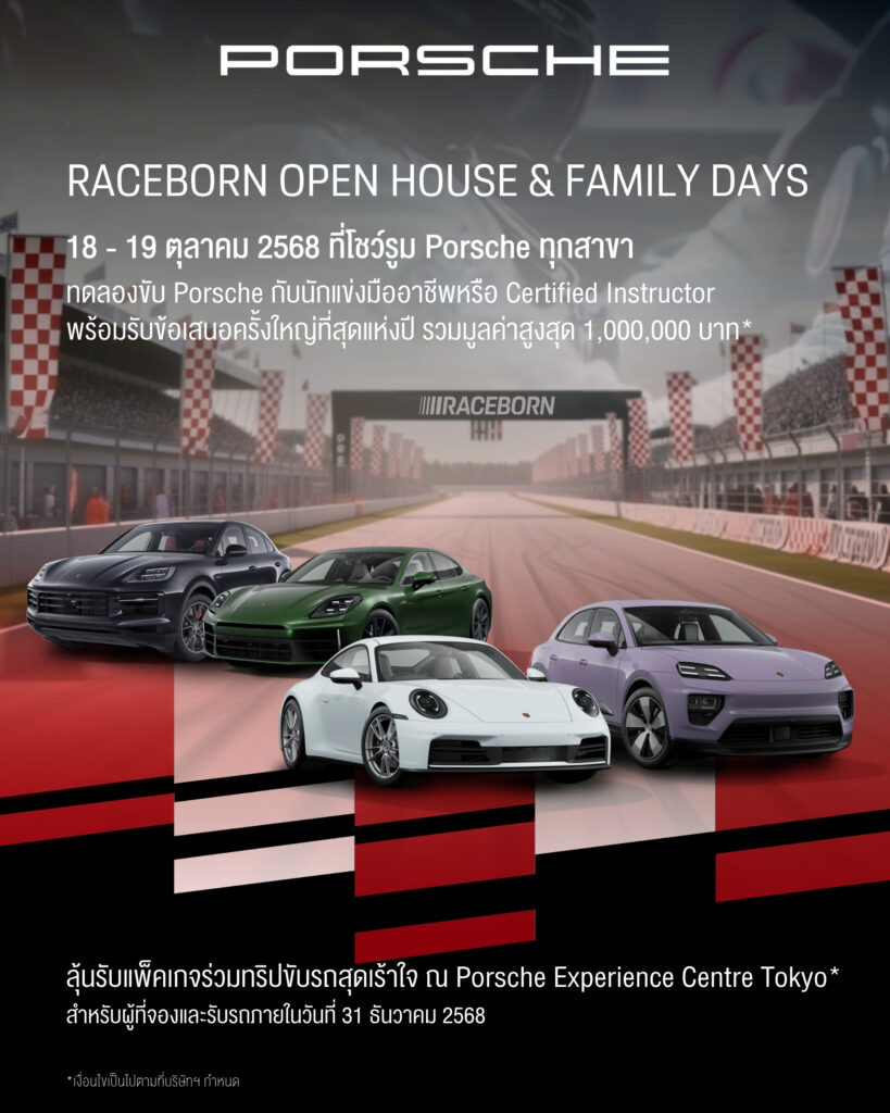 ปอร์เช่ ประเทศไทย ขอเชิญร่วมสัมผัสประสบการณ์มอเตอร์สปอร์ตสุดพิเศษที่งาน Raceborn Open House & Family Days ที่จะจัดขึ้นระหว่างวันที่ 18 – 19 ตุลาคมนี้ ที่โชว์รูมและศูนย์บริการปอร์เช่อย่างเป็นทางการทุกสาขา เพื่อเฉลิมฉลองประวัติศาสตร์มอเตอร์สปอร์ต และจิตวิญญาณรถแข่งของปอร์เช่อย่างแท้จริง โดยโชว์รูมปอร์เช่จะได้รับการเปลี่ยนโฉมเป็นธีม Raceborn พร้อมสร้างบรรยากาศที่ได้รับแรงบันดาลใจมาจากสนามแข่ง ผู้เข้าร่วมงานจะสามารถเพลิดเพลินไปกับกิจกรรมให้ความรู้และเทคนิคการขับขี่จากนักแข่งรถและผู้ฝึกสอนที่ได้รับการรับรองจากปอร์เช่ รวมถึงชมการจัดแสดงรถยนต์ปอร์เช่ในลวดลายรถแข่งอันเป็นตำนาน พร้อมด้วยกิจกรรมอื่นๆ เพื่อสร้างความเพลิดเพลินสำหรับทุกเพศทุกวัย