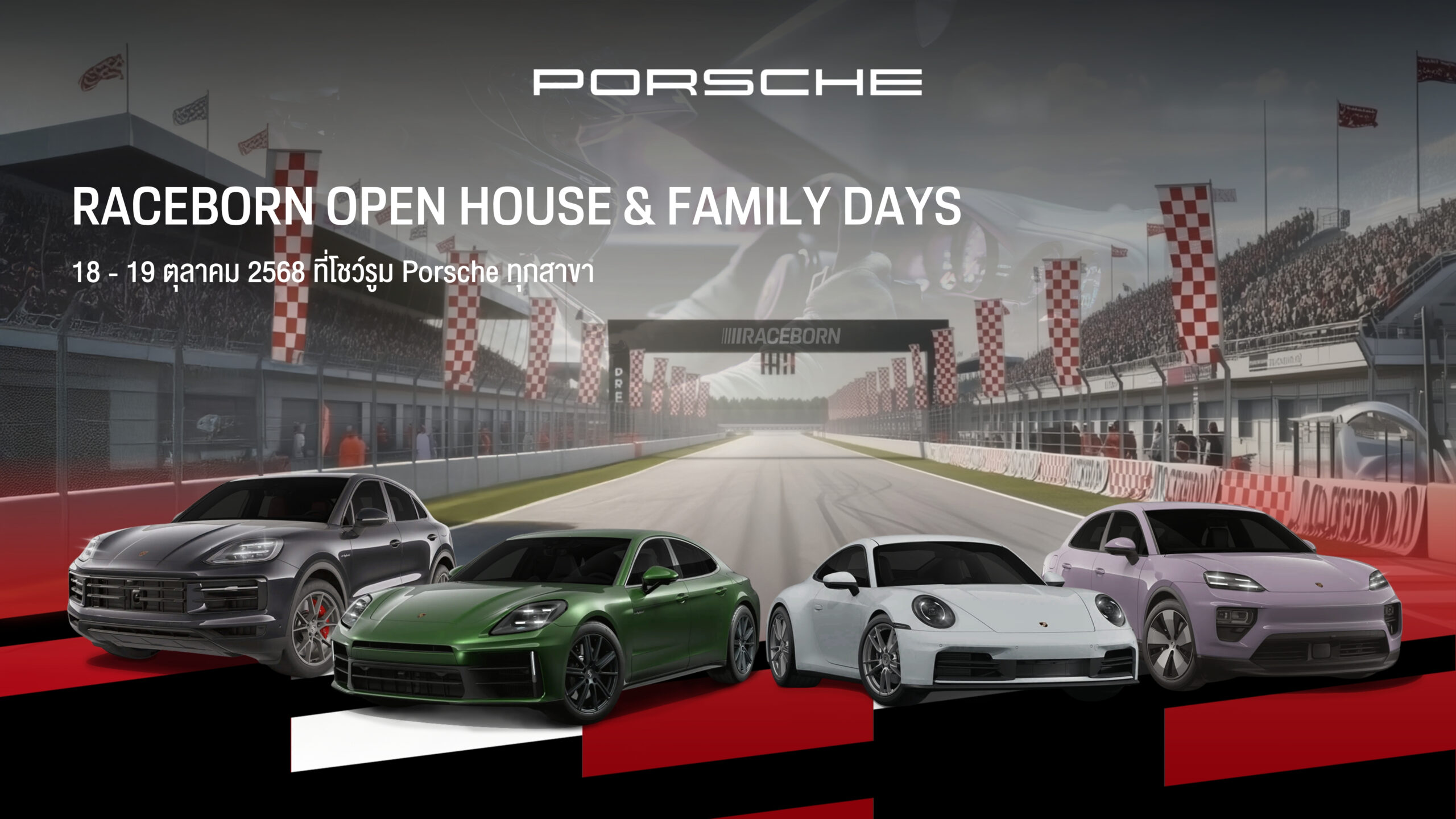 ปอร์เช่ ประเทศไทย ขอเชิญร่วมสัมผัสประสบการณ์มอเตอร์สปอร์ตสุดพิเศษที่งาน Raceborn Open House & Family Days ที่จะจัดขึ้นระหว่างวันที่ 18 – 19 ตุลาคมนี้ ที่โชว์รูมและศูนย์บริการปอร์เช่อย่างเป็นทางการทุกสาขา เพื่อเฉลิมฉลองประวัติศาสตร์มอเตอร์สปอร์ต และจิตวิญญาณรถแข่งของปอร์เช่อย่างแท้จริง โดยโชว์รูมปอร์เช่จะได้รับการเปลี่ยนโฉมเป็นธีม Raceborn พร้อมสร้างบรรยากาศที่ได้รับแรงบันดาลใจมาจากสนามแข่ง ผู้เข้าร่วมงานจะสามารถเพลิดเพลินไปกับกิจกรรมให้ความรู้และเทคนิคการขับขี่จากนักแข่งรถและผู้ฝึกสอนที่ได้รับการรับรองจากปอร์เช่ รวมถึงชมการจัดแสดงรถยนต์ปอร์เช่ในลวดลายรถแข่งอันเป็นตำนาน พร้อมด้วยกิจกรรมอื่นๆ เพื่อสร้างความเพลิดเพลินสำหรับทุกเพศทุกวัย