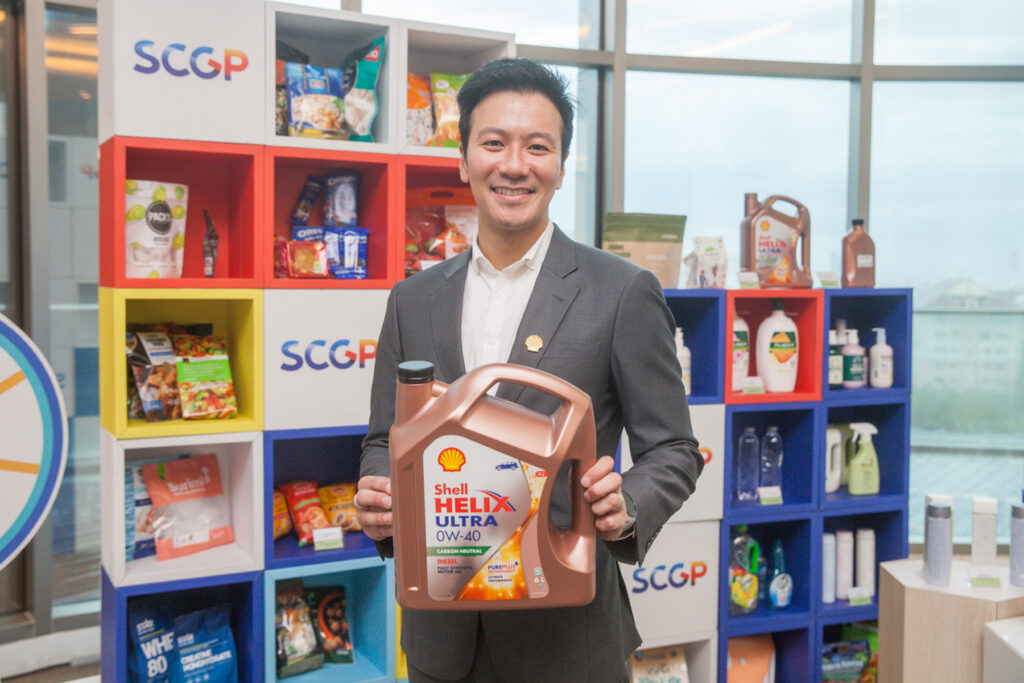 บริษัท เชลล์แห่งประเทศไทย จำกัด โดย นายกมลพัทธ์ พหลโยธิน กรรมการบริหาร ธุรกิจน้ำมันหล่อลื่น รับมอบรางวัลจาก SCGP สำหรับองค์กรที่มีความมุ่งมั่นในการดำเนินงานตามแนวทางโครงการเศรษฐกิจยั่งยืน ด้วยการใช้บรรจุภัณฑ์พลาสติกรีไซเคิล 100% สำหรับน้ำมันเครื่องพรีเมียมในตระกูล “เชลล์ เฮลิกส์ อัลตร้า” จากนายกรัณย์ เตชเสน Chief Operation Officer Consumer & Performance Packaging บริษัท เอสซีจี แพคเกจจิ้ง จำกัด (มหาชน) (SCGP) ในงาน SCG ESG Symposium ณ อาคารอเนกประสงค์ บริษัท ปูนซิเมนต์ไทย จำกัด (มหาชน) สำนักงานใหญ่ กรุงเทพฯ