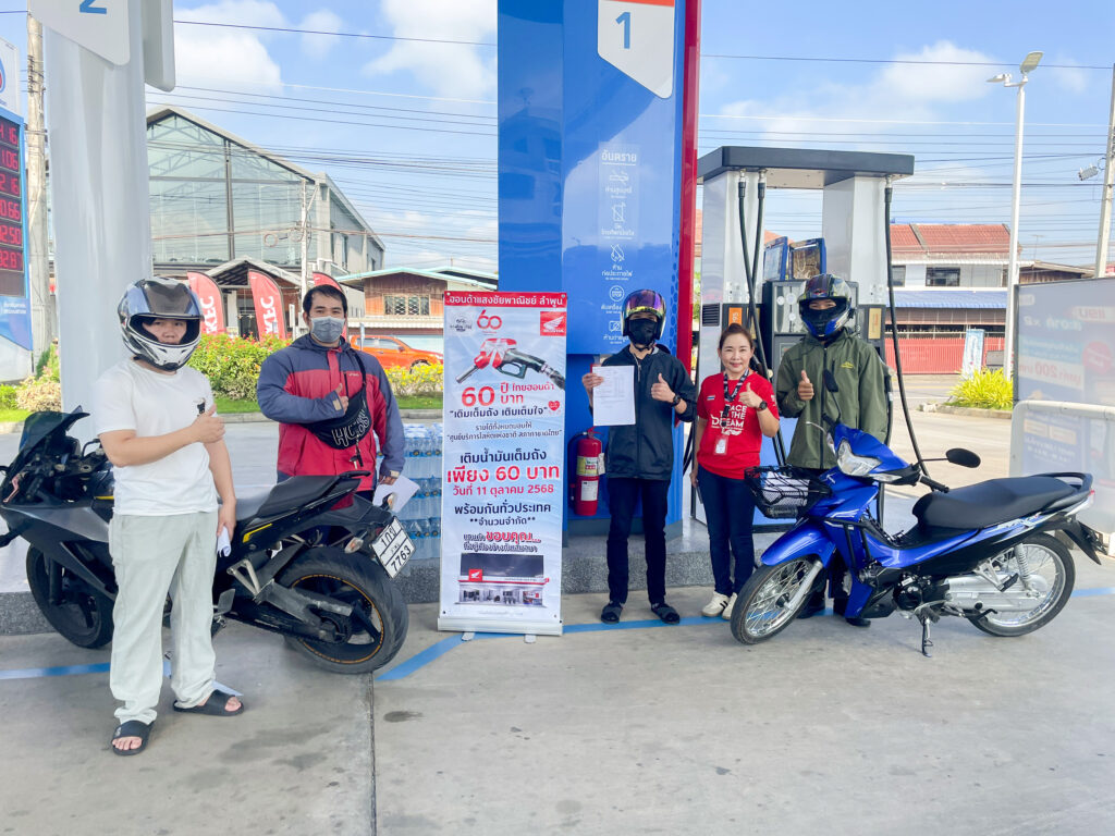 ไทยฮอนด้า ผู้ผลิตและจัดจำหน่ายรถจักรยานยนต์และเครื่องยนต์อเนกประสงค์ฮอนด้าในประเทศไทย ร่วมกับร้านผู้จำหน่ายทั่วประเทศ จัดกิจกรรมพิเศษ “เติมเต็มถัง เติมเต็มใจ” เติมน้ำมันเต็มถังในราคาเพียง 60 บาท เพื่อเป็นการขอบคุณลูกค้าชาวไทยที่มอบความไว้วางใจในแบรนด์มาอย่างยาวนานกว่า 6 ทศวรรษเนื่องในโอกาสครบรอบ 60 ปี ภายใต้แนวคิด “60 ปีไทยฮอนด้า เคียงข้างกันตลอดไป” เพื่อส่งต่อพลังแห่งความไว้วางใจจากผู้ใช้รถสู่สังคมไทย