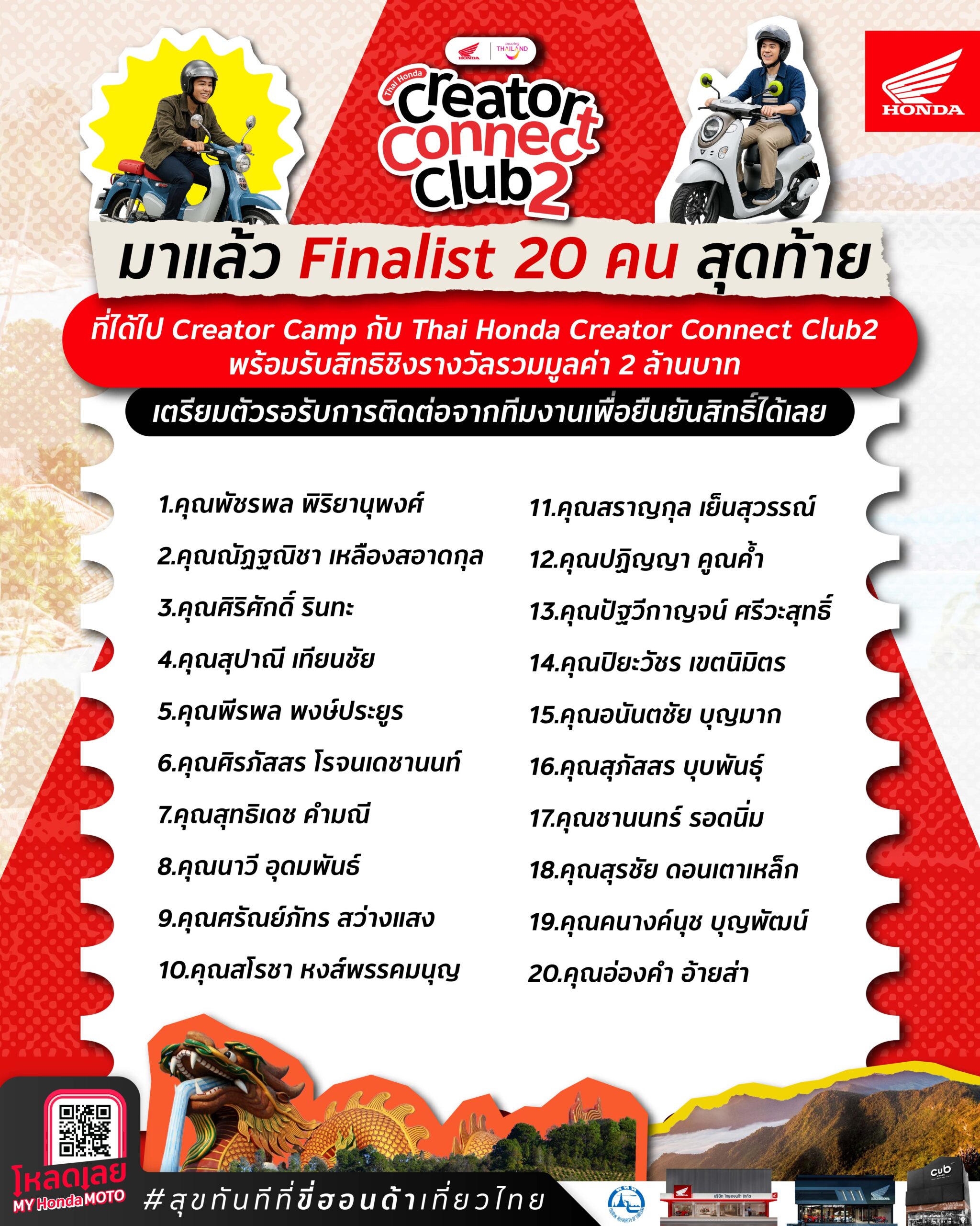 รายชื่อผู้เข้ารอบสุดท้าย Thai Honda Creator Connect Club 2 : สุขทันทีที่ขี่ฮอนด้าเที่ยวไทย จำนวน 20 ท่าน