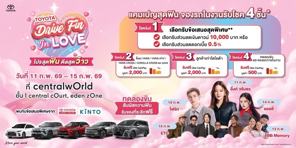 โตโยต้าเดินหน้าเปิดปี 2569 ด้วยอีเวนต์สุดพิเศษเพื่อคนเมืองกับงาน “Drive Fin In Love” โปรสุดฟิน ดีลสุดว้าว จัดเต็มใจกลางกรุงเทพฯ ณ ศูนย์การค้าเซ็นทรัลเวิลด์ ระหว่างวันที่ 11–15 กุมภาพันธ์ 2569 ชั้น 1 Central Court, Eden Zone และ Square A พร้อมเชิญชวนลูกค้าที่กำลังมองหารถคันใหม่ ทั้ง รถยนต์ไฟฟ้า 100% (BEV) และ รถยนต์ไฮบริด (HEV) มาสัมผัสรถจริง ทดลองขับจริง และรับข้อเสนอพิเศษจัดเต็มเฉพาะภายในงานเท่านั้น