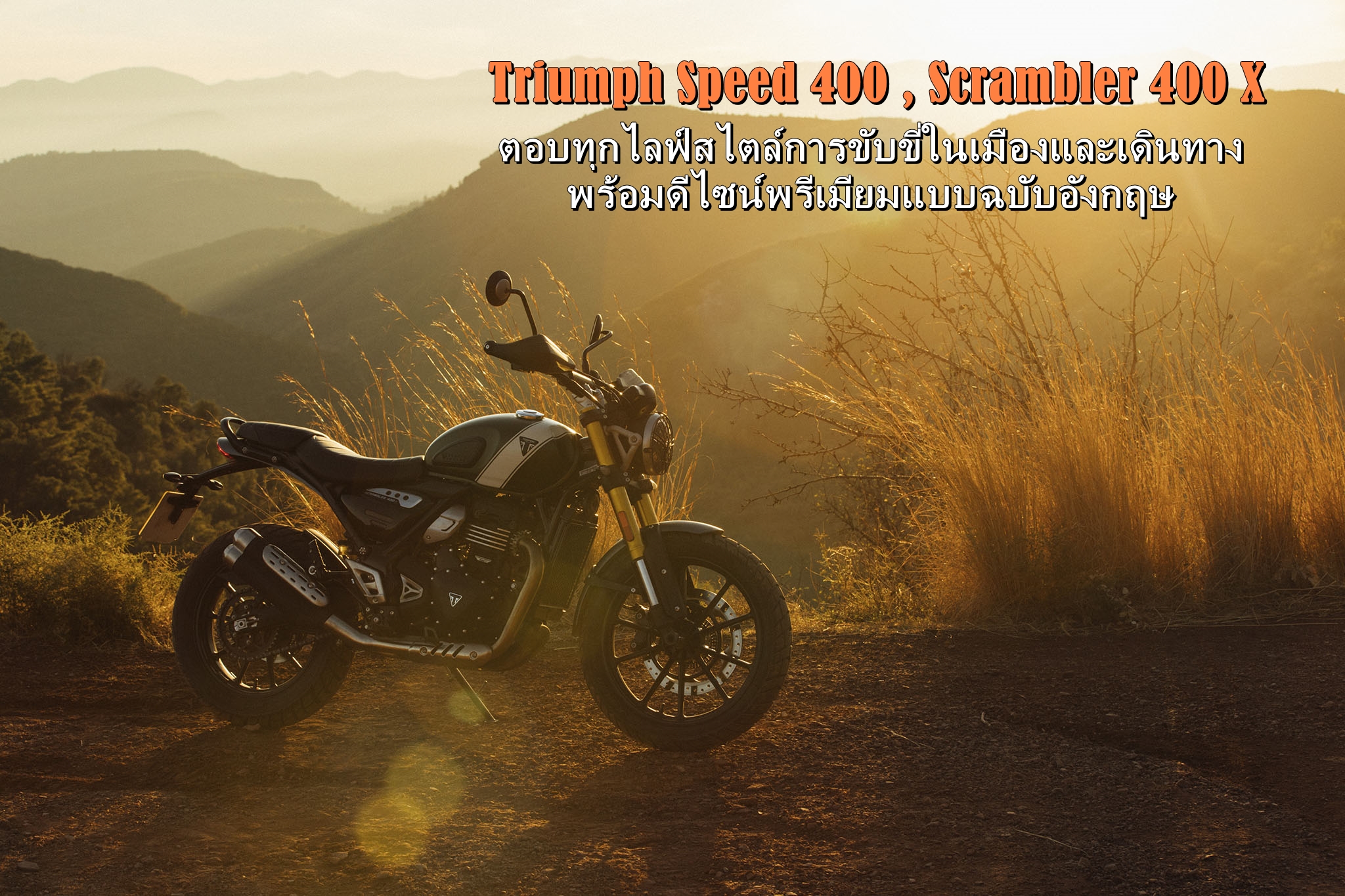 เรียกได้ว่าทั้ง Speed 400 และ Scrambler 400 X ไม่ใช่แค่รถจักรยานยนต์ธรรมดา แต่เป็นหนึ่งในเพื่อนที่รู้ใจที่จะมาช่วยเปิดประสบการณ์ใหม่ให้กับทุกคนสามารถสัมผัสความสนุกของการขับขี่ในแบบฉบับไทรอัมพ์ได้อย่างมั่นใจ ทั้งนี้ Speed 400 ราคาเริ่มต้น 165,150 บาท มาพร้อม 4 สี ได้แก่สี Carnival Red สี Caspian Blueสี Phantom Black และ สี Pearl Metallic White ส่วน Scrambler 400 X ราคา 187,150 บาท มีให้เลือกด้วยกัน 4 สี ได้แก่ สี Matt Khaki Green / Fusion White สี Carnival Red / Phantom Black สี Phantom Black / Silver Ice และสี Baja Orange / Aluminium พร้อมมอบความคุ้มค่าด้วยระยะเวลาของการเข้ารับการบำรุงรักษาที่ยาวนานถึง 16,000 กิโลเมตร รวมถึงการรับประกันคุณภาพ 2 ปีไม่จำกัดระยะทาง และบริการช่วยเหลือฉุกเฉินบนท้องถนนตลอด 24 ชั่วโมง (Roadside Assistance) เป็นระยะเวลา 2 ปีไม่จำกัดระยะทาง